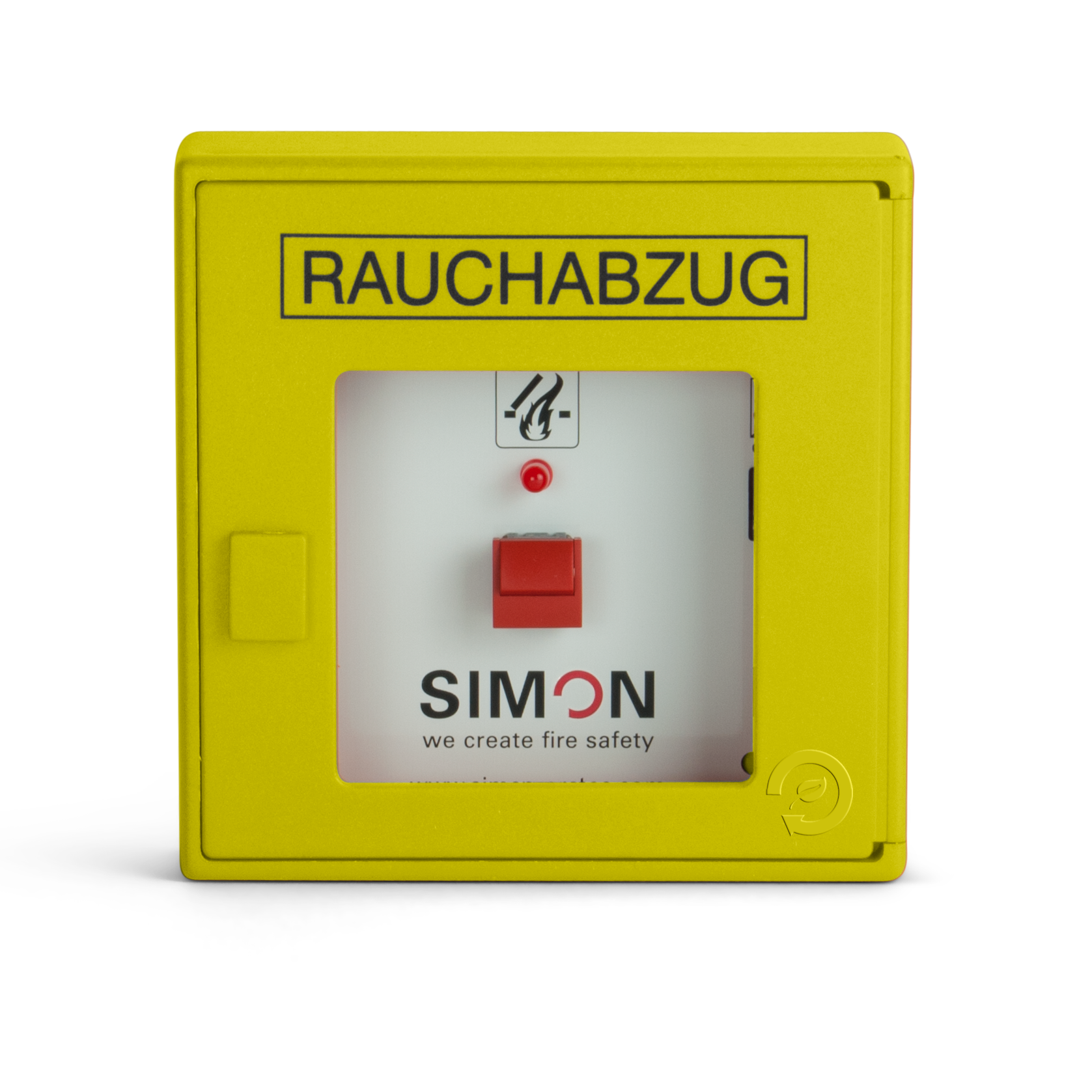 The electric SHEV emergency switch  HE-081 as offsite switch in yellow is used in smoke and heat extraction systems, type SHEV or M-SHEV. In the case of Fire it can be used to activate the electrical control system and start the smoke funnel by hand. Additionally, it shows the condition of the control system. The sustainable housing is made of biobase (up to 75 %) materials.