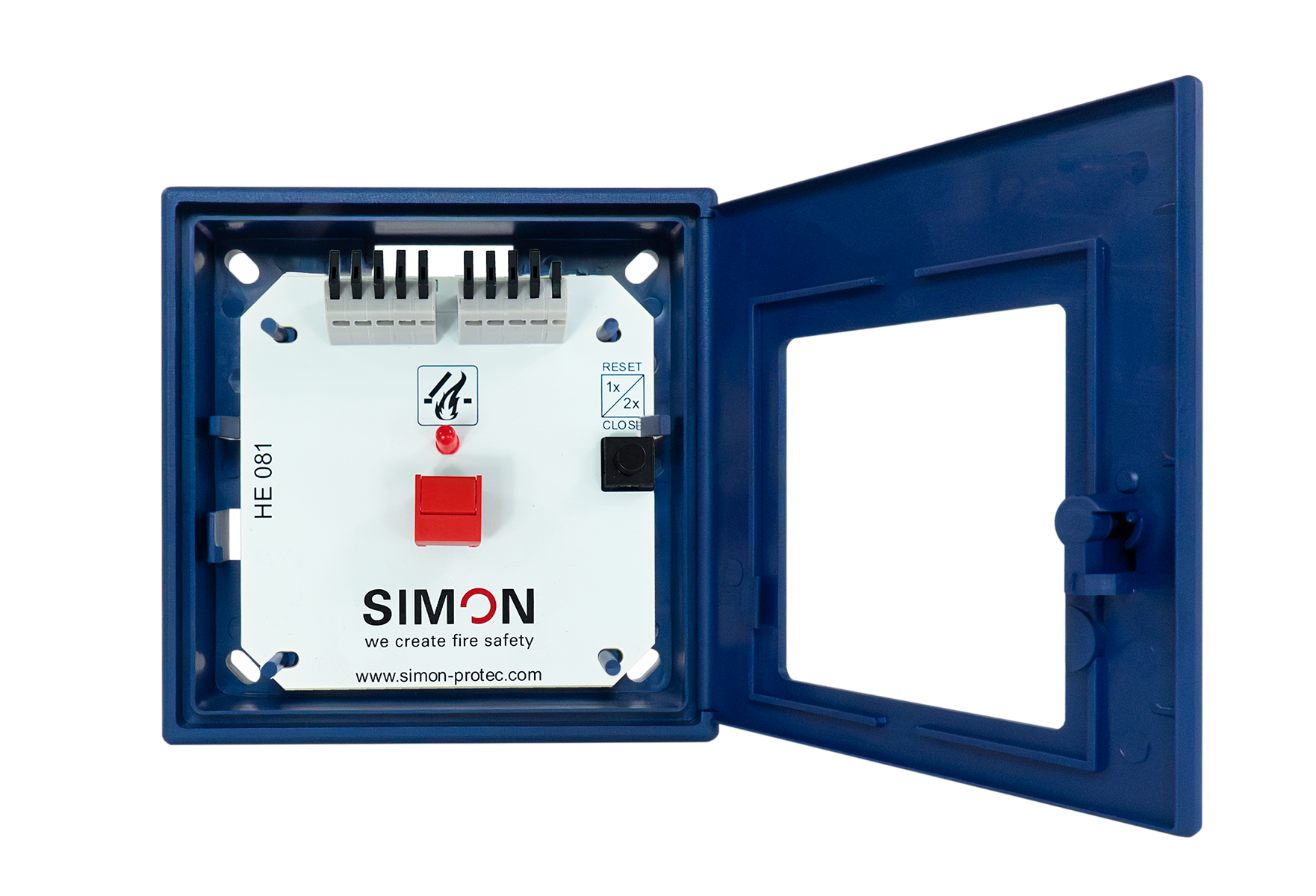 The electric SHEV emergency switch HE-081 as offsite switch in blue is used in smoke and heat extraction systems, type SHEV or M-SHEV. In the case of Fire it can be used to activate the electrical control system and start the smoke funnel by hand. Additionally, it shows the condition of the control system. The sustainable housing is made of biobase (up to 75 %) materials.